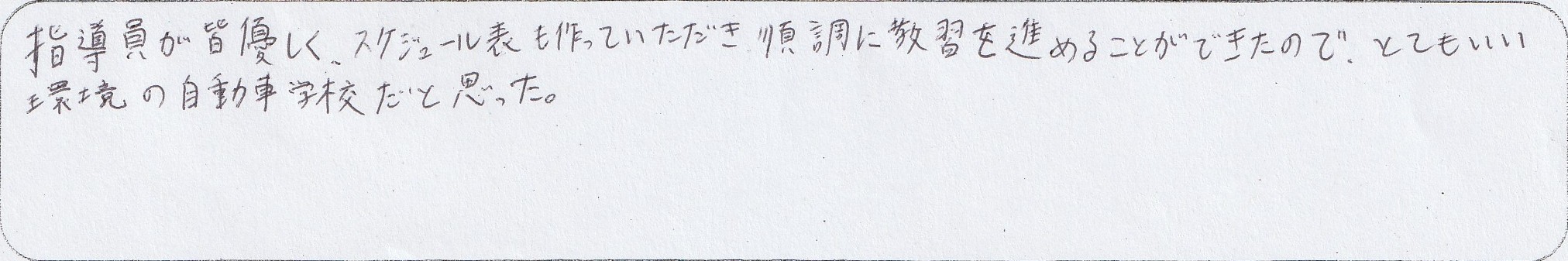 指導員が皆は優しく、スケジュール表も作っていただき、順調に教習を進めることができたので、とてもいい環境の自動車学校だと思った。