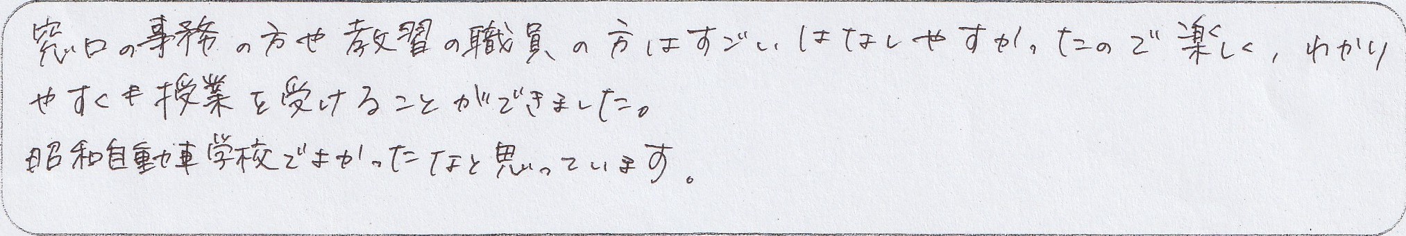 とても良い職員の方ばかりでとても楽しかったです!卒業するのが少しさみしいですが、今後も無事故無違反を心がけ、ここに戻ってくることのないよう頑張ります。たくさん話しかけてくれる方が何人かいらっしゃって、車校に来るのが楽しかったです。3ヶ月かんありがとうございました!