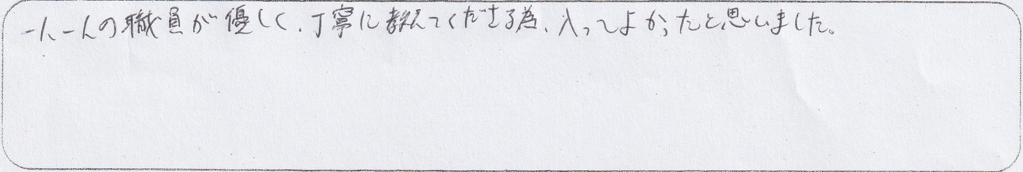 一人一人の職員が優しく、丁寧に教えてくださる為、入ってよかったと思いました。