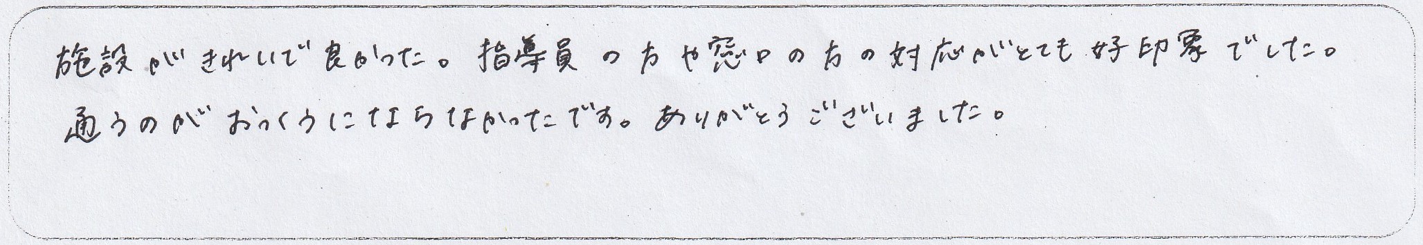 「施設がきれいで良かった。指導員の方や窓口の方の対応がとても好印象でした。通うのがおっくにならなかったです。ありがとうございました。」