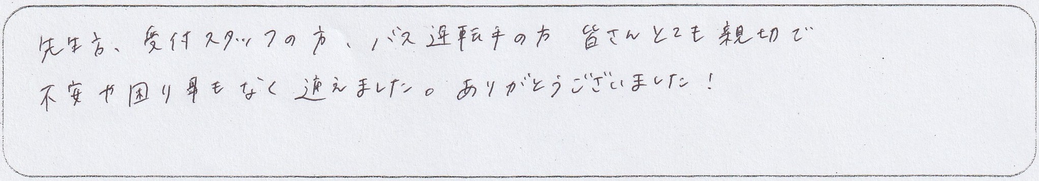 「先生方、受付スタッフの方、バス運転手の方、皆さんとても親切で不安や困りごともなく通えました。ありがとうございました。!」