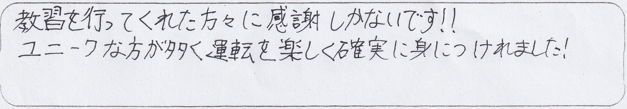 「教習を行ってくれた方々に感謝しかないです!!ユニークな方が多く運転を楽しく確実に身につけれました!」