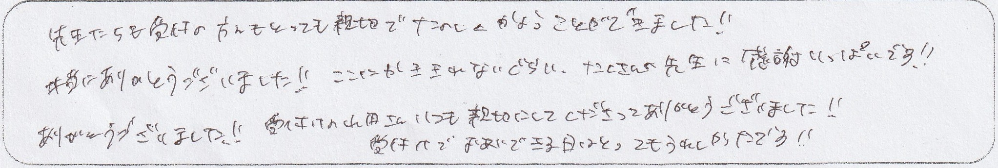 「先生たちも受付の方がもとっても親切でたのしくかようことができました!!本当にありがとうございました‼ここにかききれないぐらい、たくせんの先生に感謝いっぱいです‼ありがとうございました‼受付の山田さんいつも親切にしてくださってありがとうございました‼受付でおあいできる日はとってもうれしかったです‼」